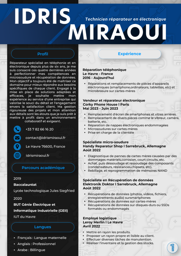 Réparateur spécialisé en téléphonie et en électronique depuis plus de six ans, je me suis consacré ces quatre dernières années à perfectionner mes compétences en microsoudure et en récupération de données. Mon objectif a toujours été de maîtriser ce domaine afin de mieux répondre aux besoins spécifiques de chaque client. Par conséquent, je suis maintenant particulièrement qualifié pour diagnostiquer et résoudre tous types de problèmes liés à la téléphonie, qu’il s’agisse d’un simple remplacement d’écran, de rebillage ou de remplacement de condensateur, et ce, de manière efficace, rapide et sur tout modèle de smartphone.