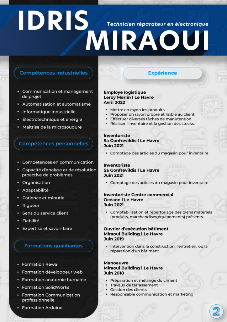 Fort de plusieurs années d’expérience dans la réparation de smartphones et d’appareils électroniques, je peux apporter une expertise technique pointue ainsi qu’une approche centrée sur le client à votre projet. Ma capacité à diagnostiquer avec précision et à résoudre efficacement les problèmes peut réduire les coûts et les délais de réparation, augmentant ainsi la satisfaction des clients. En outre, ma familiarité avec les technologies actuelles et émergentes assure une adaptation rapide aux évolutions du marché, permettant à votre entreprise de rester compétitive.